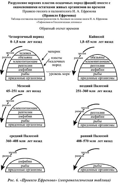 Однако палеонтология в отрыве от геологии может давать неверные представления. Об этом впервые четко и открыто заговорил наш соотечественник крупный палеонтолог и геолог Иван Антонович Ефремов. (Этот автор известен большинству публики как писатель-фантаст.) В своей книге «Тафономия и геологическая летопись» (Труды Палеонтологического института, том 24, 1950 г.) Ефремов показал, что для установления истинных масштабов эволюции необходимо пользоваться и палеонтологическими и геологическими методами одновременно.