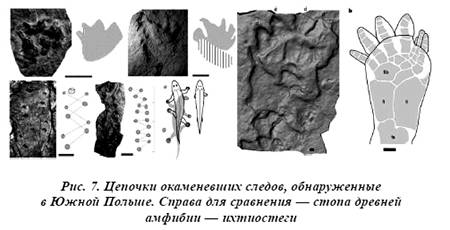 Несколько отклоняясь в сторону, нужно, тем не менее, отметить, что со времени написания Ефремовым своей работы было обнаружено немало очень ранних окаменевших свидетельств и следов высокоразвитых существ. Так, в январском номере английского журнала «Природа» была опубликована статья об обнаружении в девонском периоде палеозоя пятипалых следов, обнаруженных в Польше в 2002 и 2007 годах. Кто-то прошагал по берегу моря около 397 млн лет назад на высокоподнятых рычажных конечностей. Длина животного предположительно два с половиной метра. Вместе с тем следов волочения хвоста или туловища рядом со следами пятипалых лап не обнаружено. Неизвестное существо прошагало по берегу моря за 10 млн лет до появления первых «четвероногих» рыб и за 18 млн лет до появления первых амфибий – лабиринтодонтов).