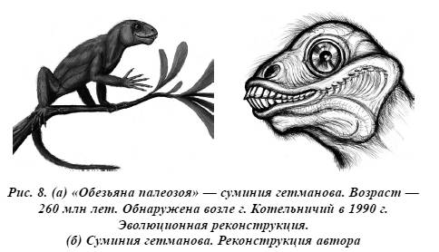 Ярким примером тому может быть существование такой группы высокоразвитых животных как зверозубые (териодонты), имевших признаки млекопитающих. Териодонты жили задолго до появления динозавров. Среди териодонтов есть удивительные формы похожие на обезьян. Это, например, суминия гетманова, обнаруженная впервые в 1990 г., спустя 18 лет после смерти Ефремова в 1972 г. Это животное вело древесный образ жизни, имело противопоставленный большой палец конечностей, цепкий хвост, крупный мозг и зубы способные пережевывать пищу. Обнаружения таких «обезьян палеозоя» является крайней редкостью. И, конечно, эволюционисты отбрасывают бренные остатки таких животных, не выстраивая из них свои восходящие эволюционные таблицы. Они существуют в их воображении как некий артефакт. Редкость обнаружения высокоразвитых животных объясняется тем, что они жили по преимуществу глубоко на континенте и их остатки если и окаменевали, то разрушались в процессе деструкции осадочных пород, вместе с этими породами, довольно быстро по масштабам геологического времени.