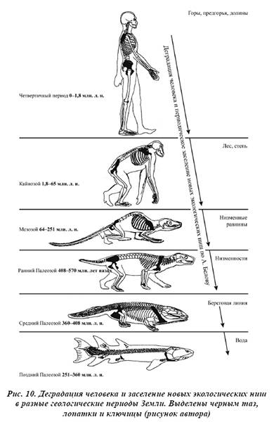 Таким образом, мы с вами наглядно видим, что адаптации древних водных животных возникли у животных отнюдь не водных, а сухопутных. Заселение водных просторов шло от суши к морю, а не наоборот! Рыбы, амфибии, водные рептилии (ихтиозавры, плезиозавры и т. д.), а также водные млекопитающие (киты, дельфины и т. д.) являются вторично водными животными. Их предки в разное время жили на суше и были более совершенны в морфологическом отношении, чем они сами. Здесь мы должны вспомнить об «экзотических формах» Ефремова. Именно их редкие находки наталкивают нас на мысль, что на суше в раннем и позднем палеозое была сформирована сухопутная фауна, о которой мы практически ничего не знаем. Пласты породы с бренными остатками этих животных были сметены последующей деструкцией горных пород.