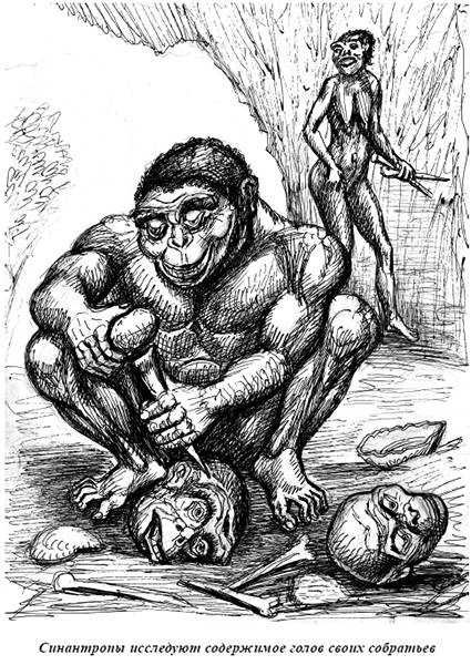 К числу наших предков относят синантропов (китайский человек), обитавших в Китае. Первый череп синантропа был вырублен из блока известняка в 1929 году в громадной пещере Чжоукоудянь (холм костей дракона), расположенной недалеко от Пекина. Позднее там же были обнаружены еще 13 черепов и останки примерно сорока особей. Венденрайх тщательно обследовал головы китайского человека и обнаружил на них следы от ударов заостренными предметами. Умертвив свою жертву, убийцы отделяли головы от туловища. Затем они обламывали края затылочного отверстия, дабы добраться до мозга, который, вероятно, с наслаждением поедали. Это, по мнению ученого, было неоспоримым свидетельством каннибализма.
