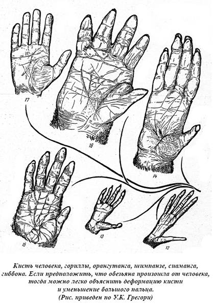 У многих древесных обезьян кисть руки сильно специализируется для обхватывания веток, так что пальцы срастаются между собой, а большой палец руки сильно сокращается в размерах. Выводить из числа этих обезьян предка человека не представляется возможным. Более того, например, у абиссинской гверецы и черной коаты атрофируется и исчезает большой палец, у обыкновенного потто – указательный. Это показывает, что большой палец руки столь необходимый человеку, для того чтобы совершать разнообразные тонкие манипуляции с предметами, становиться ненужным и даже мешает лазанию по деревьям. На деревья забрались не предки людей, а их потомки!