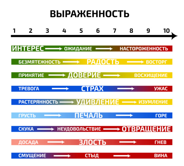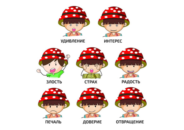 Базовые эмоции: радость, страх, удивление, доверие, интерес, злость, печаль, отвращение.
