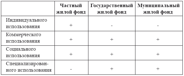 Представляется, что необходимость уяснения понятия «жилой фонд» и существующих классификаций продиктована не только содержащимся по тексту ЖК РФ одноименного термина, но главным образом тем, что понимание классификации (процесса разделения понятий на родовые и видовые) всех жилых помещений по их принадлежности к тому или иному жилищному фонду позволяет с легкостью ориентироваться как в фактически складывающихся правоотношениях между субъектами, так и в договорных конструкциях, где объектом выступают те или иные жилые помещения, поскольку отдельным видам обязательственных отношений, где в качестве объекта выступают жилые помещения, например, относящиеся к специализированному жилищному фонду, свойственны собственные исключительные особенности правового регулирования, в т. ч. по субъектному составу, сроку действия, форме, порядку заключения, исполнения и прекращения и т. п. Для более наглядного ответа на вопрос о том, какие жилые помещения могут выделяться в зависимости от принадлежности к тому или иному жилищному фонду, заключим жилые помещения в таблицу (см. Таблица № 1), в которой «+» обозначены случаи допустимого существования жилых помещений, а «-» – недопустимого.