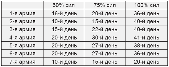 Общая готовность по этому плану определялась к 30-му дню мобилизации, когда заканчивали сосредоточение все полевые дивизии, а окончательная готовность русских армий приходилась на 45-й день мобилизации (т. е. 13-е сентября). Подтягивание окраинных корпусов доводило силы армий до 67 полевых и 31 второочередных дивизий, или 1.560 бат. 1.094 эск. и сотен и 5.708 орудий, что составляло до 85 % русских вооруженных сил. Несмотря на столь значительное превосходство в силах, все армии сильно запаздывали в сосредоточении, что позволяло противнику упредить переходом в наступление, так как полного сбора сил, достаточных для наступления, можно было ожидать только на 30-й день мобилизации [29].