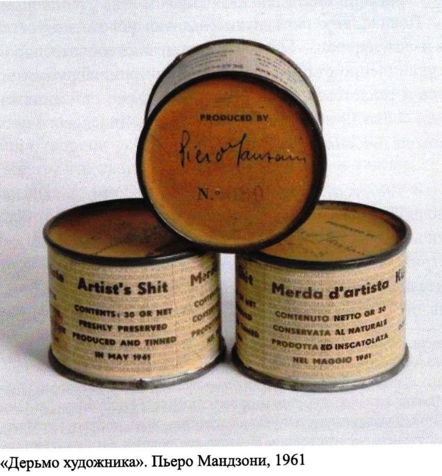 В 1961 году Пьеро Мандзони разложил собственные экскременты по 90 консервным банкам, написал на каждой Merda d'Artista; ("Дерьмо художника" – итал.); и, приравняв стоимость грамма собственных фекалий к стоимости грамма золота, распродал их коллекционерам и музеям. Он же создал «волшебный постамент», встав на который, любой человек превращался в произведение искусства.