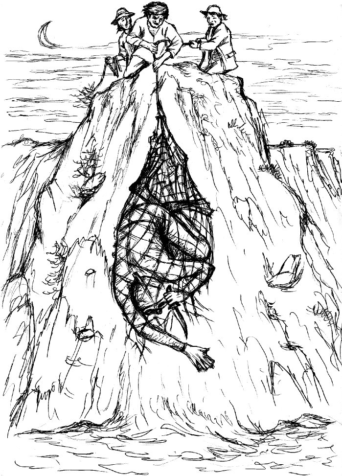 Budur, tor okeanın səthinə qalxdı, ayın zəif işığında görünürdü ki, torda yarıadam, yarıheyvan bədənli məxluq çapalayır. İri gözləri və gümüşü pulları ay işığında parıldayırdı. İblis tora ilişmiş qolunu azad etmək üçün çox böyük səy göstərirdi. O buna nail ola bildi. Belindəki ensiz qayışdan asılmış bıçağını çıxararaq toru kəsməyə başladı.