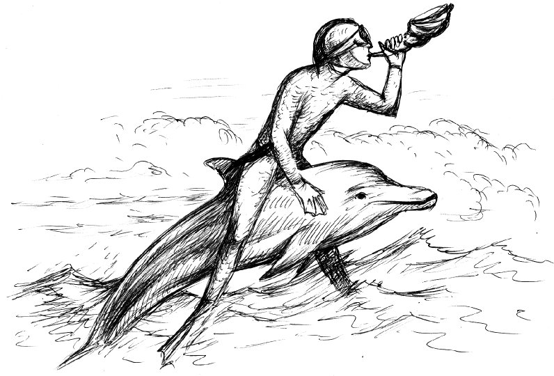 Qayanın yaxınlığında, okeanın səthində delfin sürüsü oynaşırdı. Delfinlərdən biri sürüdən ayrıldı, şeypurun çağırış səsinə cavab verirmiş kimi bərkdən fınxırdı, qayaya tərəf sürətlə üzüb onun arxasında gözdən itdi. Gərgin intizarla dolu olan bir neçə an da keçdi. Birdən ovçular qayanın arxasından çıxan delfini gördülər. İblis onun kürəyində oturmuşdu. Bədheybətin bədəni insan bədəni idi, gözləri isə günəş şüaları altında avtomobil fənəri kimi parıldayırdı. Dərisi zərif mavi-gümüşü rəngə çalırdı, əlləri qurbağa əllərinə oxşayırdı, tünd-yaşıl idi. O, əlində burulmuş uzun balıqqulağı tutmuşdu. Balıqqulağını bir da çaldı, şən qəhqəhə ilə güldü və qəflətən təmiz ispan dilində qışqırdı: