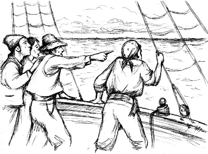 Baltazar ayağa qalxdı, göyərtənin qırağına gələrək okeanın səthinə diqqətlə baxdı. Heç nə görünmürdü. Sakitlik idi. Baltazar göyərtədə uzanmış hindunu ayağı ilə itələdi, o çömələrək qalxanda pıçıltı ilə dedi: