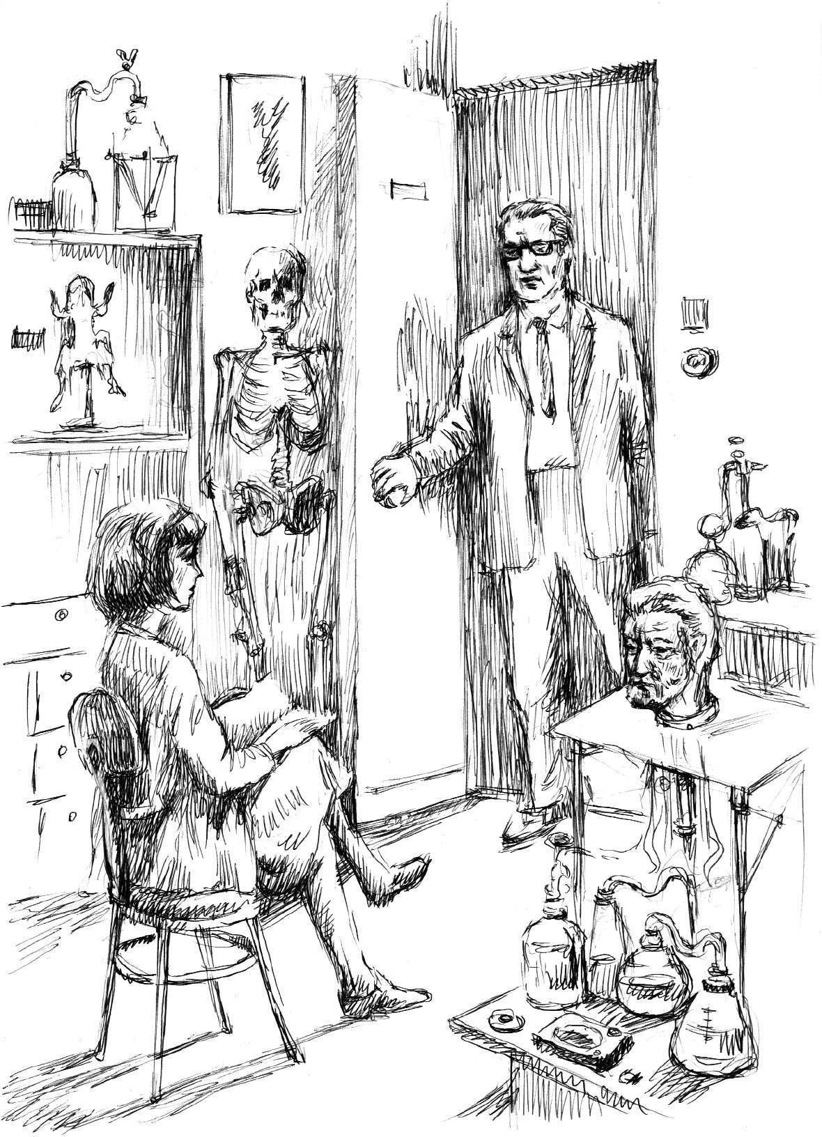 Bu başın yaxın zamanlarda vəfat etmiş görkəmli cərrah Douelin başına çox oxşadığı Loranın nəzərindən qaçmadı. Professor Douel kəsilmiş bədən üzvlərini diriltməklə məşhurlaşmışdı. Mari Loran onun mühazirələrində dəfələrlə olduğundan bu geniş alnı, dalğalı gümüşü saçları, mavi gözləri yaxşı yadında saxlamışdı. Bəli, bu, həqiqətən də, professor Douelin başı idi, yalnız burnu və dodaqları bir qədər nazilmiş, yanaqları dartılmış, gözləri çuxura düşmüş, ağ dərisi sarımtıl rəng almışdı.