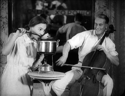 Напомним, что сюжет в фильме Козинцева и Трауберга отталкивается от нежелания Елены Александровны Кузьминой35, выпускницы одного из центральных педагогических техникумов, ехать по распределению в глухую алтайскую деревню. Перспектива скорого замужества и налаживания комфортной семейной жизни вступает в противоречие с моральной и гражданской позицией, причем поначалу гражданская позиция терпит вполне очевидное поражение. Мещанская сосредоточенность на маленьком личном счастье является тем препятствием, которое героине надлежит преодолеть на пути к полноценному советскому перевоплощению. Проекции семейной идиллии выдержаны в подспудно фарсовой стилистике: как и в «Путевке в жизнь», авторы изобразили ее в утрированно приторном духе. Символом мещанского уюта, взыскуемого героиней, выступает гипертрофированное изобилие выставленной в витрине шикарного магазина фарфоровой посуды, которая не хуже, чем в гофмановских сказках, обладает собственным голосом: в одной из сцен посуда исполняет пародийно-оперную полифоническую партию (написанную молодым Шостаковичем), варьируя на разные голоса одно и то же слово: «Останься!» Другая многократно повторяемая фраза – «Какая хорошая будет жизнь!» – в такой же оперной обработке служит фоном для нескольких сцен, пародирующих интеллигентские/мещанские представления о семейном счастье: на фоне большого зеркала с надписью «Очень хорошо» муж, весь в белом, радостно наяривает на виолончели, а жена, тоже вся в белом, приплясывает возле примуса, в такт размахивая половником и крышкой от кастрюли; та же пара, вся в белом, стоит в дверном проеме какого-то сплошь увитого белыми цветочными гирляндами транспортного средства. Транспортное средство несется на фоне проплывающих мимо облаков и высотных зданий, а за плечом у мужа одетый в ливрею и пудреный парик музыкант играет на трубе. Чуть позже, уже на Алтае, вся эта фантасмагория будет жесточайшим образом спародирована через увиденное со стороны домашнее пространство перерожденца-председателя, с двумя фарфоровыми чайниками на столе, храпящим мужем и забитой женой – на фоне все той же оперной партии.
