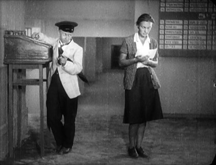 Из шести персонажей, встреченных здесь героиней, двое очевидным образом представляют собой проводников, направляющих ее в нужные пространства и инстанции. Сама ситуация предполагает, что персонаж подобной формации представляет собой функцию от системы, и по тому, как он выглядит и как действует, можно делать выводы о системе в целом. Оба проводника в Наробразе показаны как типичные «совслужащие»: это сравнительно молодые мужчины с открытыми лицами «наших» людей, одетые достаточно просто (расстегнутая косоворотка под пиджак, сорочка с расстегнутым воротом под блузой), и главная их задача – облегчать героине прохождение физических и бюрократических препятствий. Если в «социально-критической» традиции главный символ государственного учреждения – это закрытая дверь, то здесь в одном из эпизодов проводник в буквальном смысле слова открывает перед героиней дверь в святая святых, где восседает персонаж, удивительно похожий на Н. К. Крупскую. Понятно, что главной характеристикой этого пространства – в отличие от «царских» аналогов – является проницаемость для рядового гражданина.