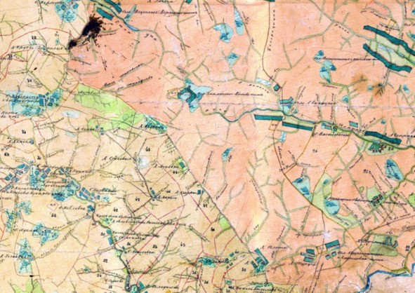 А вот фрагмент карты конца XVIII в. в районе Богородицка. В правом нижнем углу мы видим д. Плоты, она же присутствует и на современных картах.