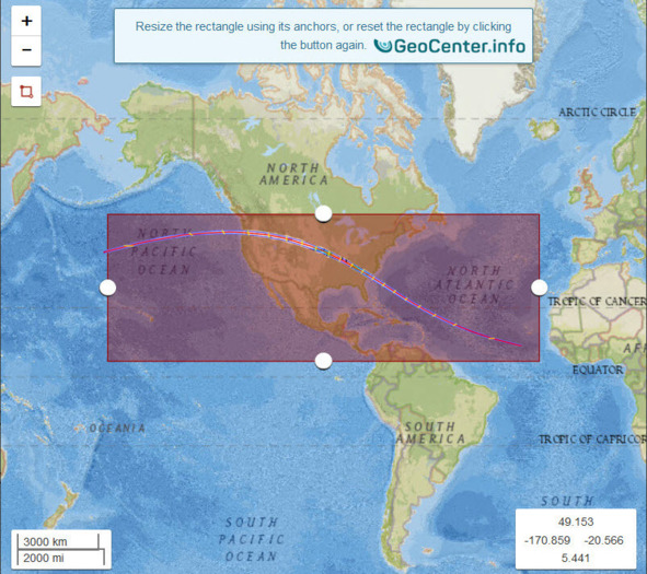 Область на карте, в которой рассматривается статистика землетрясений, красная линия – траектория полного солнечного затмения.