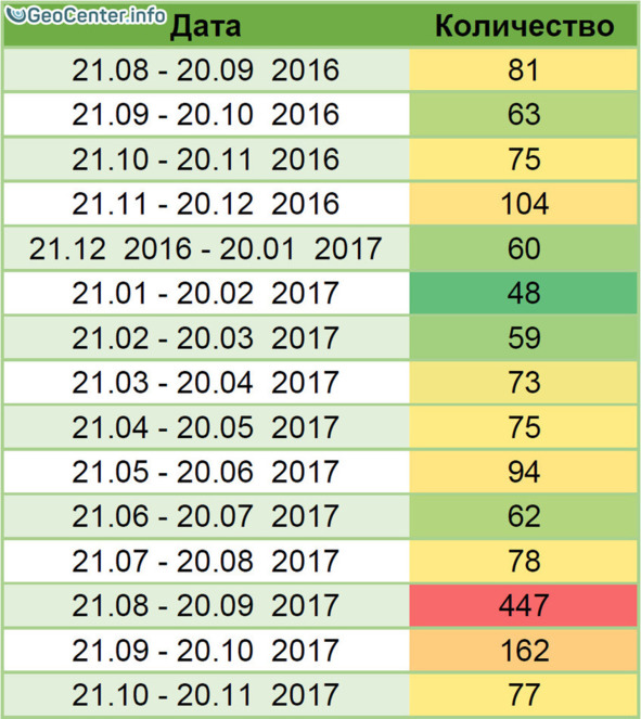 Как видно из Таблицы 1, после солнечного затмения количество землетрясений в разы возросло. Через два месяца количество землетрясений вернулось к среднему значению. За весь 2017 год только один месяц имеет существенно другое число землетрясений 447, это как раз месяц после солнечного затмения. Данные факты могут указывать на корреляцию между солнечным затмением и землетрясениями.