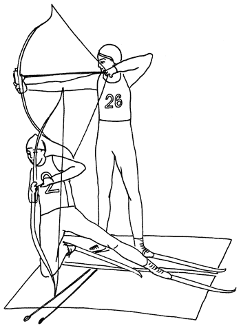Стрельба ачери-биатлонБег на лыжах со стрельбой из лука. Эта спортивная дисциплина включает в себя индивидуальное и командное соревнование по кольцевой лыжной трассе с промежуточными стрелковыми рубежами, где спортсмен выпускает 4 стрелы на рубеж по падающим мишеням. Стрельба ведется стоя и с колена (рис. 14).
