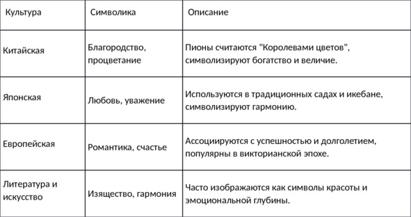 Пионы имеют глубокие корни в различных культурах и традициях. В Китае, например, пионы считаются символом богатства, процветания и благородства. Их культурное выращивание началось более двух тысяч лет назад во времена династии Хань. В Японии пионы ассоциируются с мужеством и силой, а в европейской культуре они символизируют романтику и благородство.