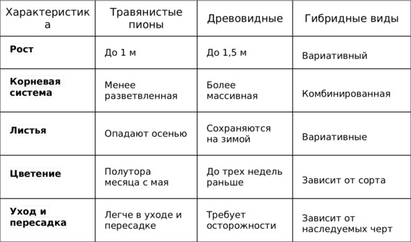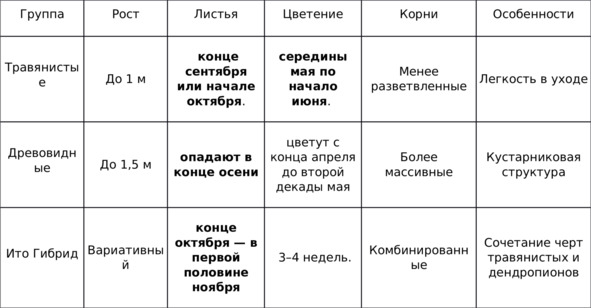 Существуют также гибриды, объединяющие черты травянистых и Древовидных, что позволяет сочетать преимущества обоих подвидов: