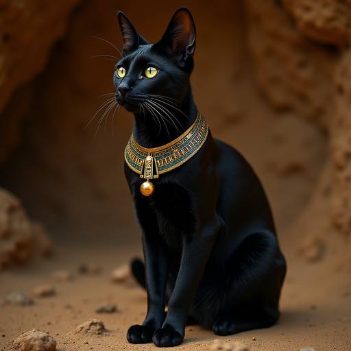 Это была большая черная кошка с ярко-желтыми глазами. На шее у Бастет был надет роскошный воротник, украшенный золотыми и зелеными элементами, а также подвеской в форме золотого шара. Ожерелье напоминало что-то из египетской мифологии. С ним она выглядела еще более грациозно и величественно.
