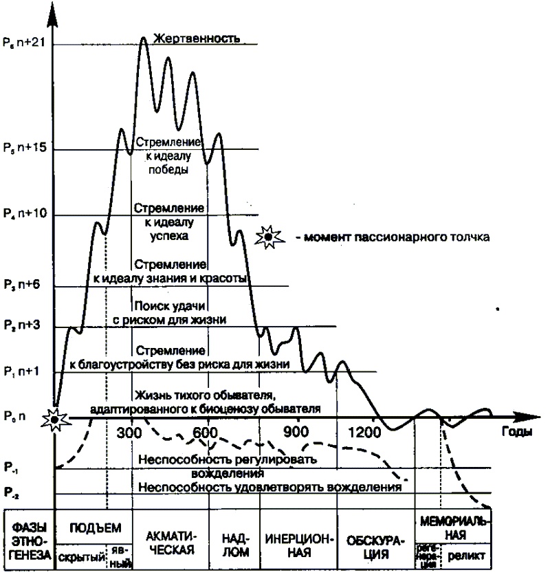 – Мемориальная фаза. Эта последняя фаза может продолжаться до 300 лет. От былого величия остаются только воспоминания – «Помни, как было прекрасно!». После того как происходит полное забвение традиций прошлого, цикл развития этноса полностью завершается.