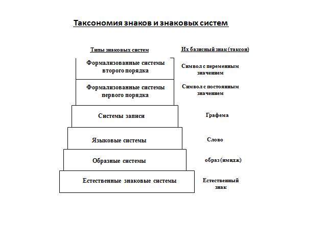 Это и есть то самое, что я обозначил как таксоны группы знаковых систем; они служат показателями повышения степени абстрактности от одной группы знаковых систем к следующей. Наименее абстрактными являются знаки природного происхождения − их можно увидеть, услышать, обонять, ощутить. Затем по степени абстрактности появляются знаки, похожие на то, что они обозначают (их таксоны − образы, имиджи). Еще более абстрактны слова, базисные знаки языка; они большей частью не похожи на своих референтов, и их приходится заучивать, чтобы понимать в речи. Буквы на письме еще дальше отстоят от реальных предметов: они обозначают звуки произносимых слов, поэтому мы называем их конвенциональными знаками, принятыми по соглашению того или иного народа или страны.