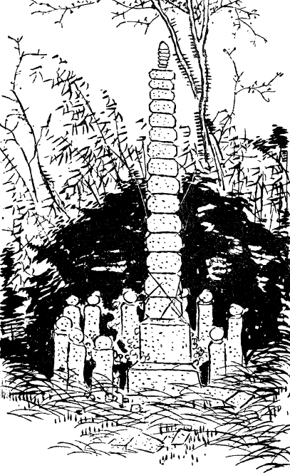 Всегда полезно рассказывать о свидетельствах, собранных по крупицам у их источника. До деревни Огури в провинции Хитати можно доехать со станции Ниихари на железнодорожной ветке Мито – Ояма.[1] На расстоянии 2 миль пути по прекрасной сельской местности, где богарное земледелие (хатакэ) перемежается с рисовыми чеками, находится деревня Ниихари. Эта деревня выглядит одним из тех тенистых оазисов, что встречаются в бескрайней степи. В большом сельском доме на западной окраине этой деревни найдены интересные памятники старины, связанные с ханваном. Сам дом находится на месте храма, посвященного Тэнцзин Сама, уничтоженного во время случившегося пожара. К несчастью, именно с тех пор считается утраченным навсегда шлем Мицусигэ. Уздечка у его коня откололась, зато остаются на месте его каймё (погребальная доска), тикара-иси, или камень с отпечатком его большого пальца как показателем его силы, а также мамори-хондзон, или металлическое изображение синтоистского бога войны Хатимана, считающегося покровителем воинов, которое он всегда носил с собой. Изображение божества-хранителя представляет собой фигурку высотой 6,35 сантиметра, хранящуюся в буцудане, или небольшом футляре высотой 30,5 сантиметра. Сразу к западу от этого дома в густом кустарнике выделяется могила Мицусигэ в виде внушительного камня высотой без малого 6 метров. Рядом находится 10 могил, и две из них более позднего периода истории – эпохи Тэмпо (1830–1843). Неподалеку оборудовано современное захоронение с искусным надгробным камнем. К востоку от сельского дома примерно в 300 метрах на открытом хатаке сохранились остатки насыпи замка. Притом что они составляют как максимум 3 метра в высоту, насыпь обозначена очень четко. Этот замок стоял на открытой равнине в миле от холмов подножия горной гряды нижней области провинции Хитати. Непосредственно рядом с ним никакой реки не протекает. На таком же расстоянии к западу (скажем, метров триста) в тени находится деревня Огури. Хотя это и не касается нашего основного предмета изложения, но, преодолев полмили на восток по объездной дороге, можно добраться до дерева муку (афананте тернистый), стоящего на вершине холма посередине хатакэ. К стволу этого дерева кто-то прислонил два плоских камня, и ими, как говорят, обозначили место захоронения Хэйси-но (Тайра-но) Масакадо, который здесь провел свой последний бой и встретил смерть от руки Тавары Тоды. На расстоянии в несколько метров находится валун из мелантерита – судзури-иси. Он врос в землю на несколько метров и представляет собой мощное основание с углублением как минимум в фут ши риной, совершенно очевидно служившее фундаментом просторного строения. Местные жители складывают о нем такие вот легенды. Понятно, что основанием для традиции Фудзисавы она не служит.[2]