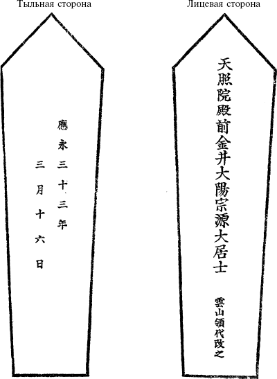 Данная дощечка показана в Ниихари – Огури как каймё, принадлежащее хозяину замка по имени Огури, разрушенного в 30 году периода Оэй (1423). На ней написано: «Тэнсю-Ин-Дэн дзэн Канаи Дайё Согэн дайкодзи. Ундзэн Рёдай коре во аратаму». На тыльной стороне: «33 год третий месяц 16 день периода Оэй» (23 апреля 1426 года). Тэнсю-Ин-Дэн – это посмертное имя покойного (дайкодзи), при жизни известного как Канаи Дайё Согэн; это посмертное имя присвоено жрецом Ундзэном Рёдаем. Слово «дзи» передает противоположный смысл фразы «коре во аратаму»