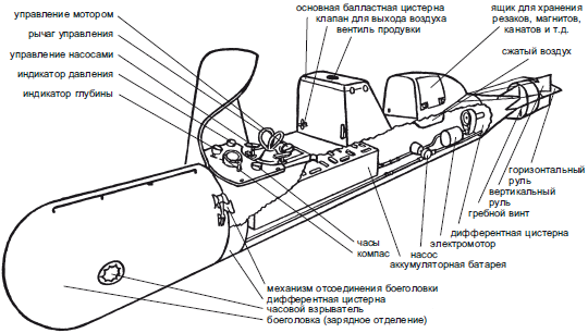 Итак, «Первая настоящая» была совершенно готова к пробежке. Она была того же размера, как и обыкновенная 21-дюймовая (533-миллиметровая) торпеда, с отделяемой головной частью, содержащей 600 фунтов взрывчатого вещества. Ее аккумуляторная батарея могла проработать около шести часов при скорости от 2–9 узлов, что обеспечивало дальность действия примерно в 18 миль. Она имела балластную цистерну, как и деревянная модель, компас, приборную панель с несколькими светящимися циферблатами, очень похожую на панель автомобиля, а в корме – обычный руль и руль глубины. Как и у «Кэссиди», были некоторые проблемы с ручным управлением при погружении в воду, но на этом их сходство заканчивалось. Надо было оседлать ее и двигаться вперед – по крайней мере так думал каждый.