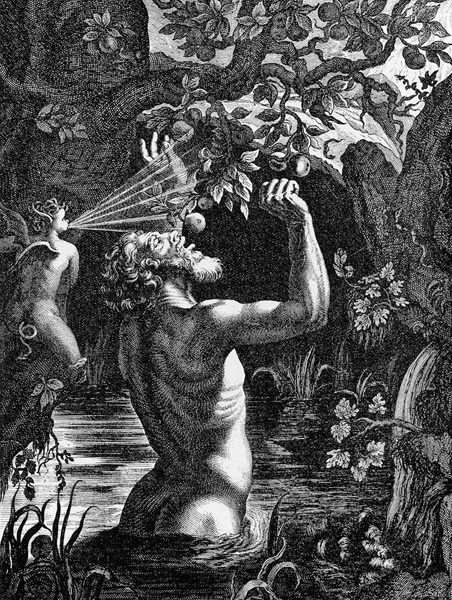 Страдал он также и от ужасного голода. Великолепные фруктовые деревья, росшие на берегу пруда, простирали над его головой свои ветви. Сладкие груши, яблоки, фиги и гранаты притягивали его взгляд, но лишь только он собирался сорвать их – сильный порыв ветра отклонял ветви, и несчастный мог только издали смотреть на них, терзаемый муками голода.