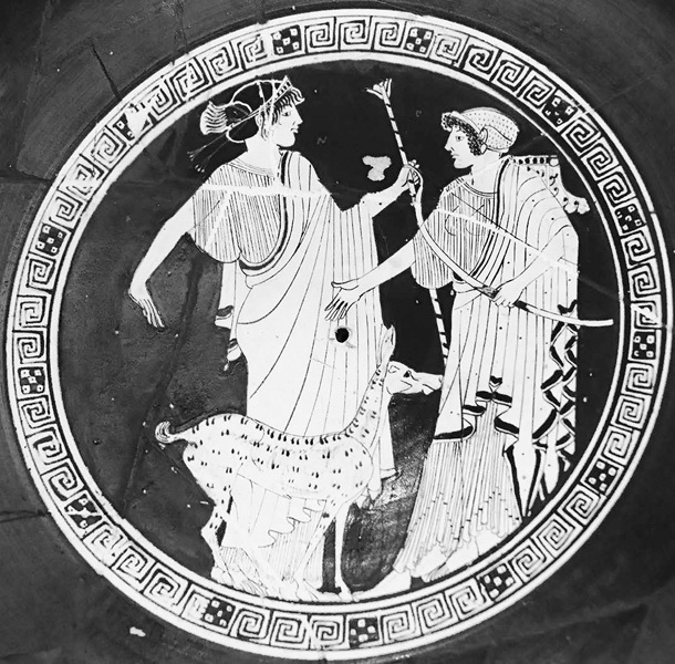Аполлон и Артемида. Краснофигурное тондо на килике. Ок. 470 г. до н. э.