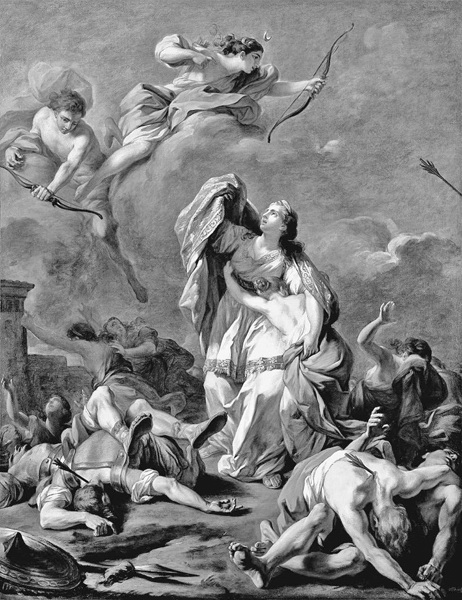 Даже сам безжалостный стрелок был тронут мольбами малютки, но пущенную стрелу вернуть уже было нельзя, и мальчик пал, сраженный внезапной, безболезненной смертью, так как стрела попала прямо в сердце. Так погибли все семь сыновей Ниобы.