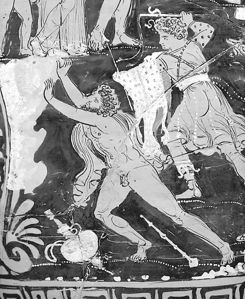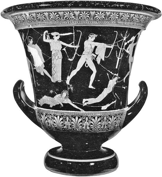 Аполлон и Артемида убивают детей Ниобы. Роспись краснофигурного кратера. Ок. 460 до н. э.