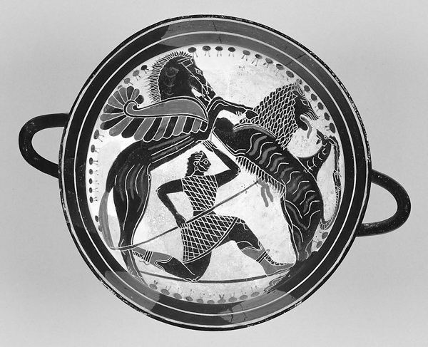 Беллерофонт, Пегас и Химера. Лаконианский чернофигурный килик. Работа приписывается художнику Бореадов. Ок. 570–565 гг. до н. э.