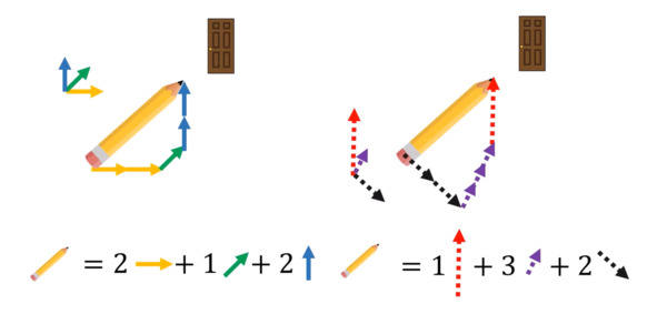 Координаты вектора (карандаша) в разных системах. Компоненты разные, но описывают один и тот же объект – карандаш.