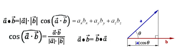 Скалярное произведение векторов в результате даёт число, равное произведению длины проекции первого вектора на второй и наоборот.