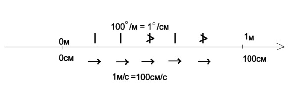 В одномерном пространстве базис можно сменить, лишь сдвинув начало отсчёта или изменив единицу длины. Так что разнообразие координат не велико. Мы же в нашем примере для простоты поменяем единицу измерения! Перейдём от метров к сантиметрам, уменьшив тем самым единицу измерения аж в 100 раз. Температура, как и положено настоящему скалярному полю, никак на эти изменения не отреагирует. В точке «1 метр» или, как мы теперь считаем, «100 см» она как была равна 100 градусам, так таковой там и осталась. При этом градиент температуры, как величина, имеющая направление, изменился. Он был равен 100 градусов на единицу длины, а стал равен 1 градусу на единицу длины. Таким образом, компонента градиента численно уменьшилась в сто раз, как и единица длины, как базисный вектор, если угодно. Запомним это! Скорость газа тоже изменилась, но противоположным образом! Она у нас была 1 единица длины в секунду, а стала теперь равна 100 единицам длины в секунду. То есть её компонента, напротив, выросла численно в 100 раз!
