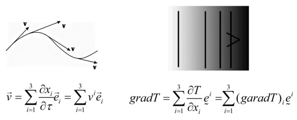 Вот и учёным мужам прошлого показалось так же. С тех пор объекты типа скорости называют векторами и обозначают буквами с индексами координат сверху, а объекты, подобные градиенту, называют ковекторами, и индексы компонент пишут у них снизу. В англоязычной литературе есть способ запомнить, где какой индекс ставить. Вектора называют контравариантным объектом, так как они преобразуются противоположным способом базису. В слове contravariance латинская буква «n» похожа на стрелочку, указывающую вверх, что напоминает о положении индекса у такого объекта вверху. И наоборот, ковекторы преобразуются так же, как базис, и в символизирующем это слове сovariance буква «v» напоминает стрелочку вниз, также напоминая математику о местоположении ковариантных индексов.