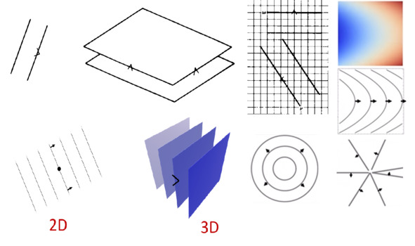 Если же мы внимательно посмотрим на ковектор, в качестве первого примера которого брали градиент, то наглядная аналогия-интерпретация придёт сама. Её подскажет сама суть, сама природа градиента. Что такое градиент? Это направление наискорейшего возрастания некоей величины. Если мы рассматриваем поле температур на плоскости, то можем провести линии через те точки, в которых температура имеет одно и то же значение. Выберем, например, шаг в 10 градусов. И при возрастании температуры на 10 градусов будем отмечать это линией. Допустим, температура возрастает только слева направо. Тогда линии постоянства температуры будут вертикальными. И чем быстрее температура растёт, тем ближе они будут располагаться друг к другу. Вот мы и получаем наглядное представление ковектора! Это стопка линий (в более общем случае – поверхностей), на которой для ещё большего удобства галочкой показывают направление наибольшего роста величины.