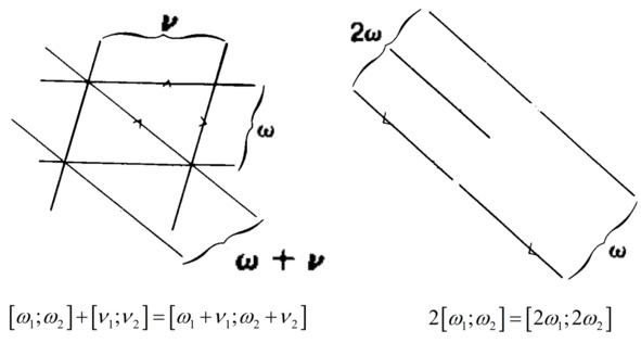 Для построения алгебры ковекторов полезно будет проводить аналогию с операциями над векторами и смотреть, как отличается их геометрическая интерпретация от собственно знакомых нам векторов. Мы умеем складывать два вектора. Конец одного прилагаем к началу другого и проводим линию от свободного конца первого вектора к свободному концу второго. Ковекторы можно тоже складывать. Но если мы помедитируем над тем, как сделать сложение таковым, чтобы оно сохраняло основные свойства ковекторов, то придём к следующему способу. Чертим первый ковектор в виде линий, затем на нём чертим второй. Линии обоих ковекторов образуют параллелограмм. Суммарным ковектором будут являться линии, проходящие через вершину этого параллелограмма и его диагональ.