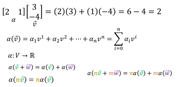 Прежде всего стоит заметить, что ковектор олицетворяет собой линейную функцию. Это весьма удобно. С линейными функциями и операторами крайне просто обращаться. Вынося из-под них множители, не нужно их возводить в какую-то степень или делать ещё более хитрые операции. Проверить это можно непосредственным вычислением в общем виде. Берём сперва складываем вектора, а потом действуем на них ковектором, а потом сперва действуем на оба вектора ковектором и складываем результаты. Значение данного отображения в обоих случаях совпадёт. Так же проверяется и линейность при умножении ковектора на число. Сперва умножаем вектор на число, а затем «съедаем» его ковектором и сравниваем с тем, что получилось при противоположном порядке действий: поглощённый ковектором вектор, после преобразования его в число, умножаем на константу.