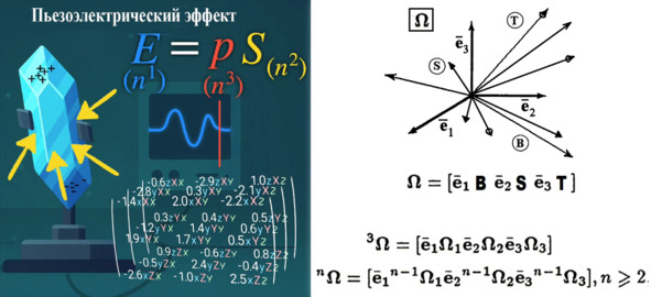 Таким образом, более высшие тензоры описывают связи, где результат зависит от нескольких направлений (например, пьезоэлектричество требует учёта механического напряжения в плоскости и генерации поля в третьем направлении). Они позволяют ещё точнее описать анизотропию в кристаллах и композитах, у которых свойства зависят от направления, что требует тензоров с большим числом компонент. Тензоры высоких рангов возникают в нелинейных теориях (например, в общей теории относительности). Тензоры ранга три и выше – это инструменты для описания сложных физических, механических и геометрических явлений, где простые векторы или матрицы недостаточны. Они позволяют компактно записывать законы природы, сохраняя информацию о многомерных взаимодействиях и анизотропии.