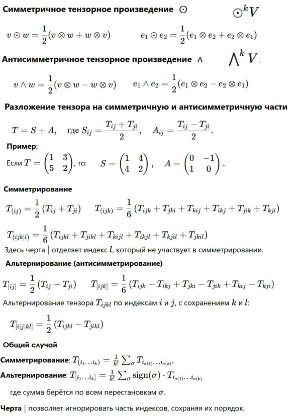 Тензорное произведение – это как конструктор, который склеивает векторы и тензоры в более сложные объекты высших рангов. Но иногда хочется, чтобы эти объекты обладали уже заведомо дополнительными свойствами: например, не менялись при перестановке индексов (симметрия) или, наоборот, меняли знак (антисимметрия). Для этого математики придумали два специальных «инструмента»: симметричное и антисимметричное тензорные произведения.