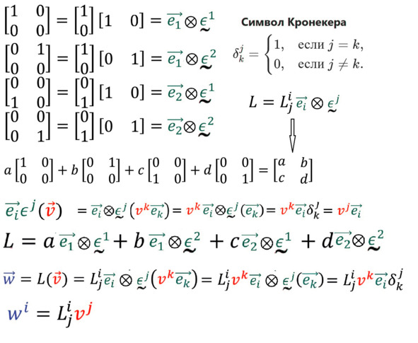Совсем легко вычислять и рассматривать тензорное произведение через компоненты. Нам не важно, сколько у них индексов, и сверху они или снизу. Такие произведения дадут компоненты нового объекта, который будет иметь индексы как первого, так и второго множителя. Можно тензорные произведения раскладывать по базисным векторам и ковекторам, которые тоже, перемножаясь, дают новый объект – базис в пространстве тензоров более высокого ранга.