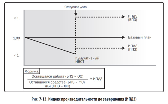 Индекс производительности до завершения (ИПДЗ) – расчетный показатель эффективности выполнения проекта по стоимости, который необходимо достичь с оставшимися ресурсами, чтобы добиться установленного управленческого показателя, выражаемого в виде отношения стоимости выполнения оставшейся части работ к оставшемуся бюджету. ИПДЗ представляет собой вычисляемый индекс выполнения стоимости, который необходимо обеспечить на оставшихся работах для достижения определенной управленческой цели, такой как БПЗ или ППЗ. Если становится очевидным, что БПЗ больше не является реалистичным, руководитель проекта должен рассмотреть ППЗ. После одобрения ППЗ может заменить БПЗ при расчете ИПДЗ. Формула для ИПДЗ, основанного на БПЗ: (БПЗ – ОО) / (БПЗ – ФС). ИПДЗ концептуально представлен на рисунке ниже. Формула для ИПДЗ показана в левом нижнем углу – оставшаяся работа (определена как БПЗ минус ОО), деленная на оставшиеся средства (которые могут рассчитываться либо как БПЗ минус ФС, либо как ППЗ минус ФС).