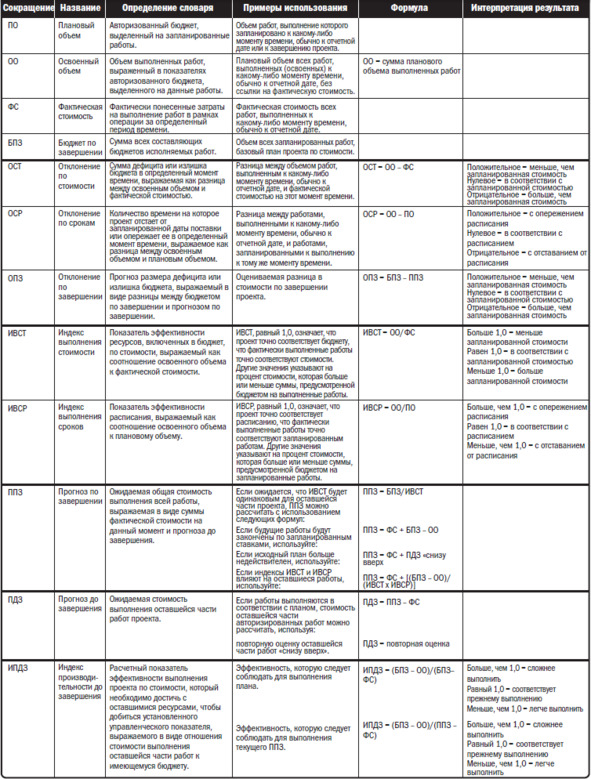 Если кумулятивный ИВСТ ниже базового плана (как показано на рисунке ниже), все будущие работы по проекту немедленно должны выполняться в соответствии с ИПДЗ (БПЗ) (что отражено в верхней линии рисунке ниже), чтобы оставаться в рамках авторизованного БПЗ. Суждение о том, является ли данный уровень исполнения достижимым, принимается на основе ряда соображений, включая риски, расписание и техническое исполнение. Этот уровень исполнения изображен в виде линии ИПДЗ (ППЗ). Формула для ИПДЗ, основанного на ППЗ: (БПЗ – ОО) / (ППЗ – ФС). Формулы EVM представлены в таблице ниже.