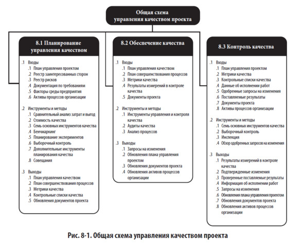 Управление качеством проекта включает в себя процессы и действия исполняющей организации, которые определяют политики, цели и сферы ответственности в области качества таким образом, чтобы проект удовлетворял тем потребностям, ради которых он был предпринят. Управление качеством проекта использует политики и процедуры для внедрения системы управления качеством организации в контексте проекта и, при необходимости, поддерживает действия по постоянному совершенствованию процессов, предпринимаемых исполняющей организацией. Управление качеством проекта направлено на обеспечение соответствия требованиям к проекту, включая требования к продукту, и подтверждение такого соответствия.