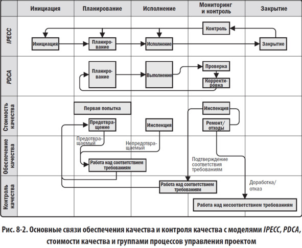 – Постоянное совершенствование. Цикл «планирование-выполнение-проверка-действие» (plan-do-check-act, PDCA) – модель, описанная Шухартом и усовершенствованная Демингом, – является основой для улучшения качества. Кроме того, инициативы по улучшению качества, такие как всеобщее управление качеством (Total Quality Management, TQM), методика «шести сигм» и совместное применение методики «шести сигм» и бережливого производства (Lean Six Sigma), могут улучшить качество управления проектом, а также качество продукта проекта. Среди моделей совершенствования процессов можно привести модель качества Малкольма Болдриджа, модель зрелости организационного управления проектами (Organizational Project Management Maturity Model, OPM3®) и комплексную модель производительности и зрелости (Capability Maturity Model Integrated, CMMI®).