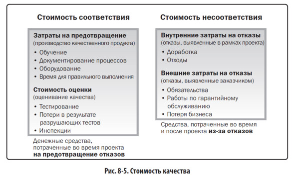 – Стоимость качества (cost of quality, COQ). Стоимость качества – это общая стоимость работы над соответствием и работы над несоответствием требованиям, которая должна быть выполнена в качестве компенсационного усилия, поскольку при первой попытке выполнения этой работы существует потенциальная возможность, что какая-то часть требуемого объема работ может быть выполнена или была выполнена неправильно. Затраты на выполнение работ по обеспечению качества могут возникать на протяжении всего жизненного цикла поставляемого результата. Например, решения, принятые командой проекта, могут повлиять на операционные затраты, связанные с использованием выполненного поставляемого результата. Затраты, связанные с обеспечением качества после закрытия проекта, могут возникать в результате возвратов продуктов, претензий по гарантии и кампаний по отзыву продукции. Таким образом, вследствие временного характера проекта и потенциальной выгоды, которая может быть получена в результате снижения послепроектной стоимости качества, спонсирующие организации могут принять решение об инвестировании средств в улучшение качества продукта. Данные инвестиции, как правило, делаются в области работы над соответствием требованиям с целью предотвращения дефектов или снижения стоимости дефектов путем инспекции несоответствующих требованиям единиц продукции. Более того, вопросы, связанные с постпроектной COQ, должны решаться в процессе управления программой и управления портфелем, например офисы управления проектами, программами и портфелями должны применять соответствующие методы анализа, шаблоны и способы выделения финансовых средств для этой цели.
