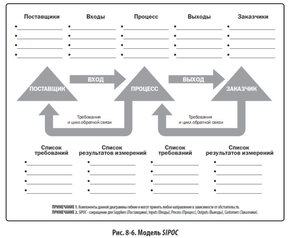 – Блок-схемы, также называемые картами процессов, так как они отображают последовательность шагов и возможности разветвления процесса, трансформирующего один или более входов в один или более выходов. Блок-схемы отражают операции, точки принятия решений, циклы, параллельные пути и порядок выполнения процессов путем представления в виде карты операционных деталей процедур, которые существуют в пределах горизонтальной цепочки создания ценности модели SIPOC. Блок-схемы могут оказаться полезными для понимания и оценки стоимости качества в рамках процесса. Это достигается путем использования логики разветвления потока работ и связанных с ней относительных частот для оценки ожидаемой денежной стоимости работы над соответствием и работы над несоответствием требованиям, необходимой для предоставления выхода, соответствующего требованиям.