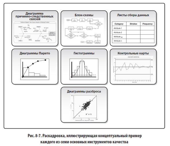 Семь основных инструментов качества, также известные в отрасли как инструменты 7QC, используются в контексте цикла PDCA для решения проблем, связанных с качеством. Рис. ниже представляет собой концептуальную иллюстрацию семи основных инструментов качества, которые включают в себя: